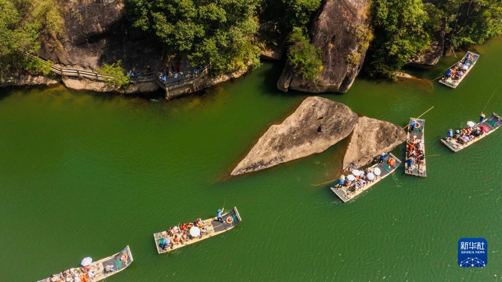 9月11日,在福建武夷山國家公園,游客乘竹筏游覽九曲溪(無人機照片)。新華社發(陳穎 攝)