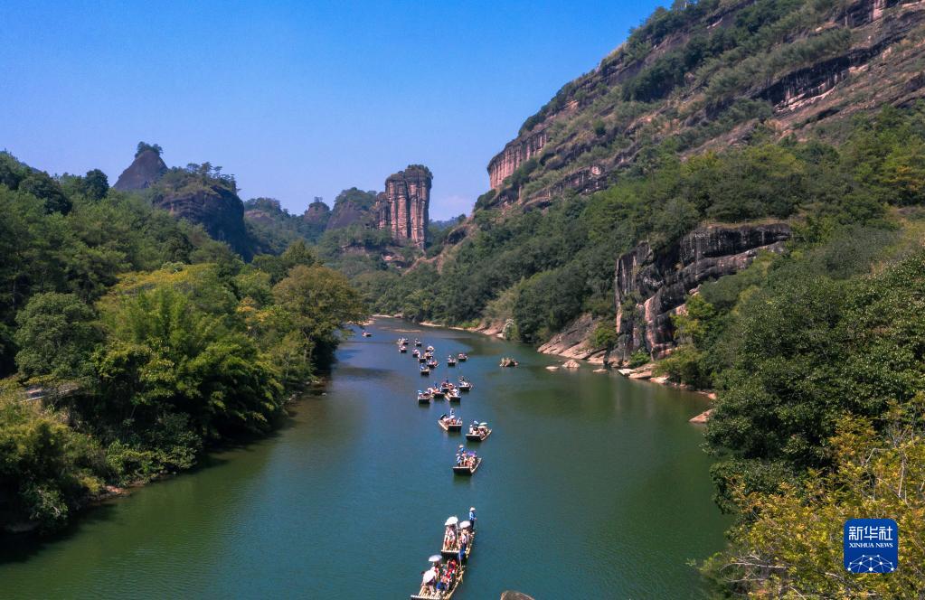 9月11日,在福建武夷山國家公園,游客乘竹筏游覽九曲溪(無人機照片)。新華社發(陳穎 攝)