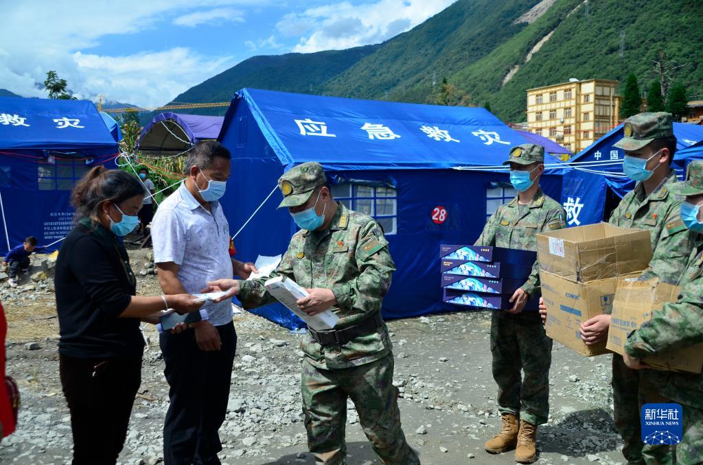 9月10日,聯保部隊第945醫院應急醫療分隊為瀘定縣磨西鎮受災群眾送去生活物資。