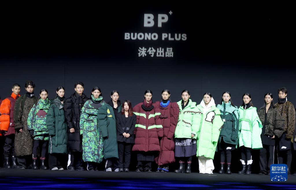 9月11日,設計師姜佳(中)和模特在北京中國國際時裝周(2023春夏系列)舉行的“BUONO PLUS·姜佳”時裝發布會上謝幕。