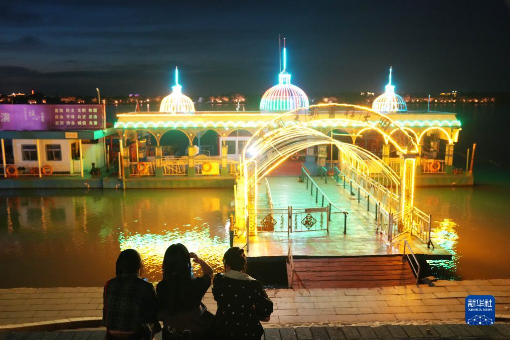 中秋假日,冰城哈爾濱市的松花江畔夜色迷人,吸引市民前來賞景游玩。