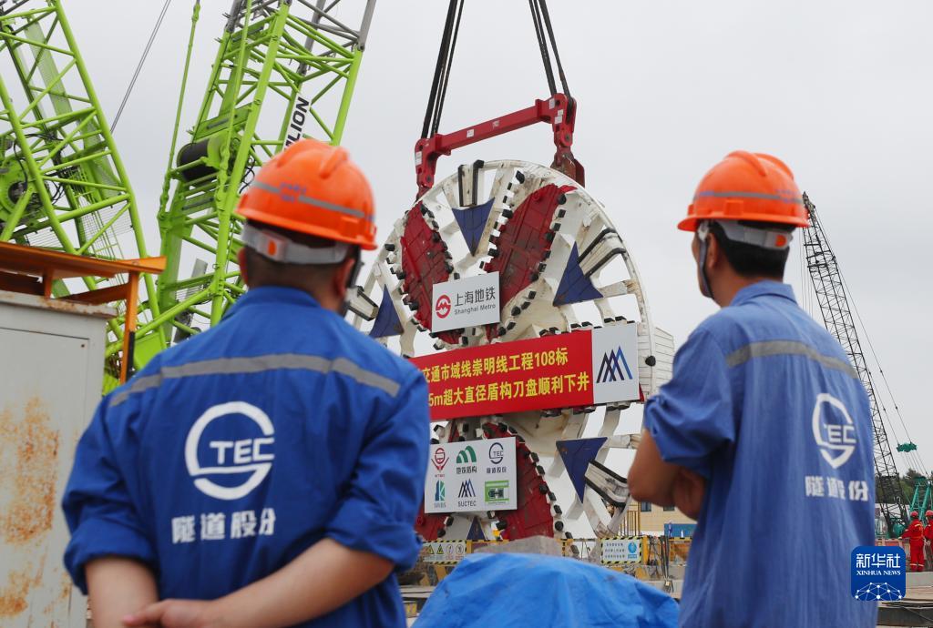9月12日,施工人員在觀看“申通號”盾構機刀盤吊裝下井作業施工。