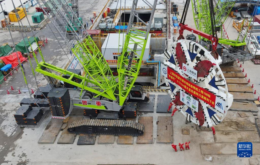 9月12日拍攝的軌道交通崇明線108標“申通號”盾構機刀盤吊裝下井作業施工現場(無人機照片)。