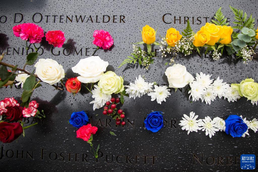 9月11日,在美國紐約的“9·11”紀念廣場,鮮花擺放在紀念池邊刻有遇難者姓名的銅牌上。