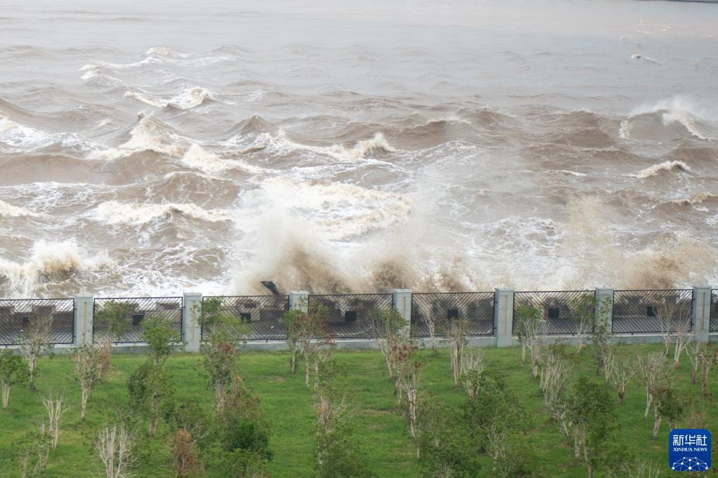 9月12日,錢塘江潮水拍打江堤形成巨浪。