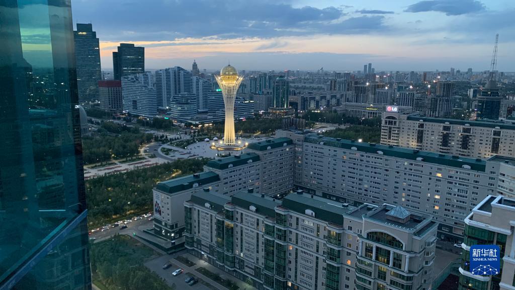 這是9月10日在哈薩克斯坦努爾蘇丹拍攝的巴伊杰列克觀景塔和周邊建筑。