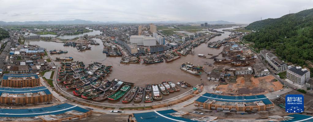 9月13日,漁船停泊在浙江省龍港市舥艚避風港躲避臺風(無人機照片)。