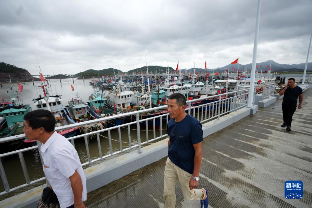 9月13日,在浙江省寧波市象山縣新橋崇站避風錨地,當地漁民從避風的漁船邊走過。