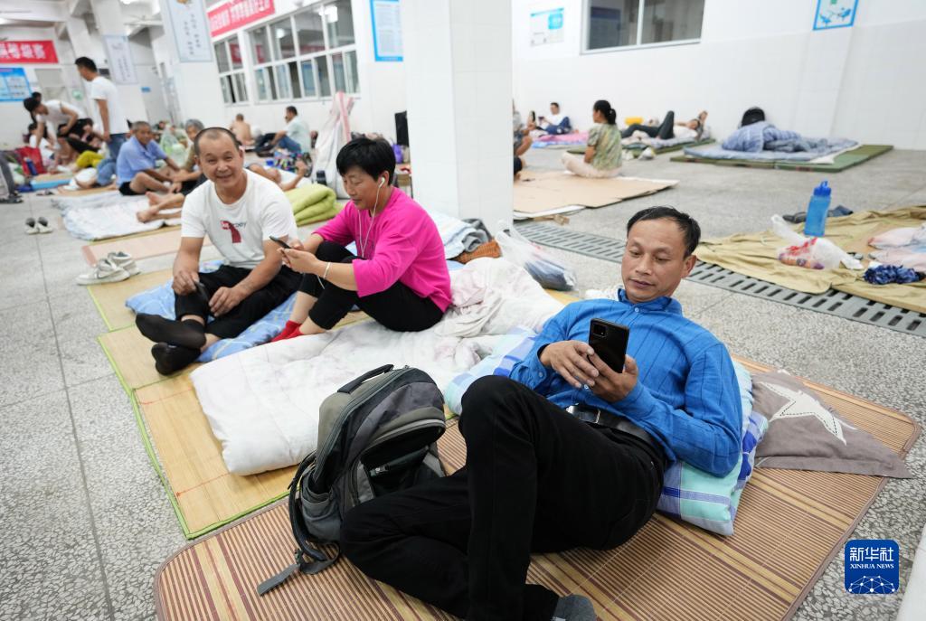 9月13日,浙江省寧波市象山縣丹城第二中學,來自附近建筑工地的務工人員被安置在學校餐廳內休息。