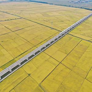 高鐵列車從吉林省公主嶺市沃野間駛過(2021年9月19日攝,無人機照片)。新華社記者 張楠 攝