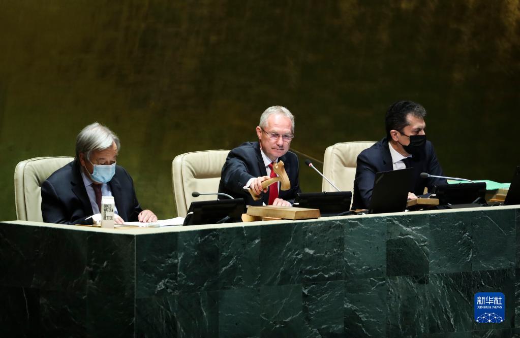 9月13日,在位于紐約的聯合國總部,第77屆聯合國大會主席克勒希(中)主持會議。