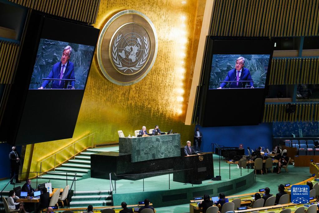 9月13日,在位于紐約的聯合國總部,聯合國秘書長古特雷斯在第77屆聯合國大會第一次全會上致辭。