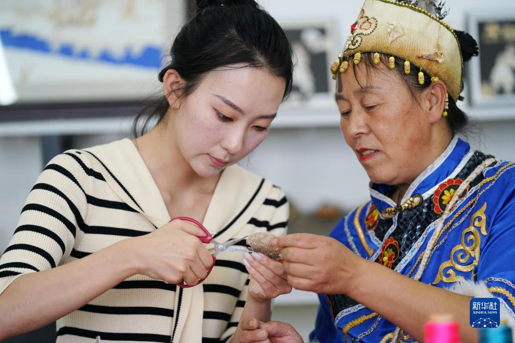 9月7日,尚美含(左)與當地的魚皮制作技藝傳承人一起研究手工藝品制作。