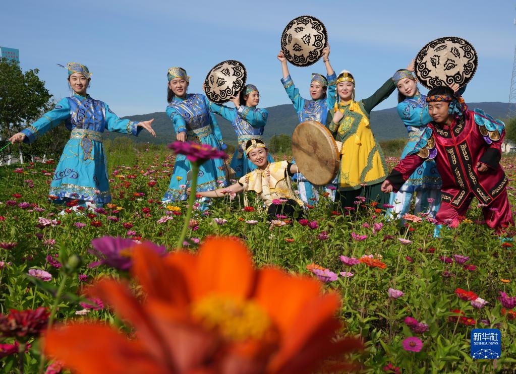 9月4日,在黑龍江撫遠市烏蘇鎮抓吉赫哲族村,尚美含(右二)和赫哲族青年排練民族舞蹈。