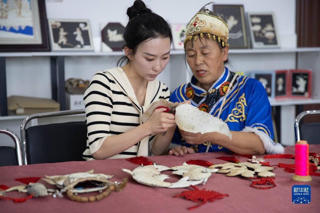 9月7日,在黑龍江撫遠市烏蘇鎮抓吉赫哲族村,尚美含(左)向魚皮制作技藝傳承人學習魚皮藝術品制作。