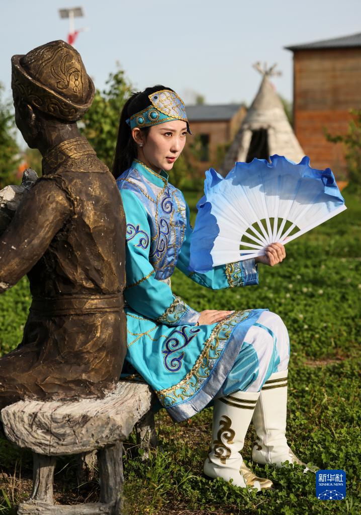9月4日,在黑龍江撫遠市烏蘇鎮抓吉赫哲族村,尚美含身著赫哲族服裝拍攝照片。