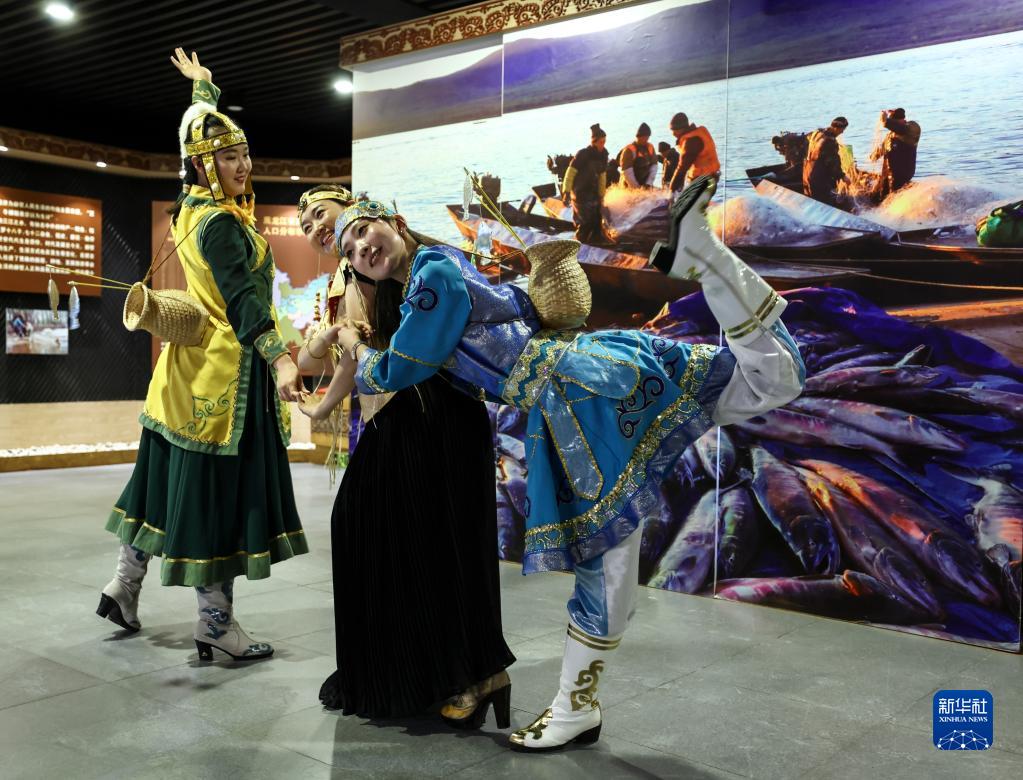 9月4日,在黑龍江撫遠市烏蘇鎮抓吉赫哲族村赫哲民俗展示館內,尚美含(右一)和赫哲族女孩一起表演民族舞蹈。