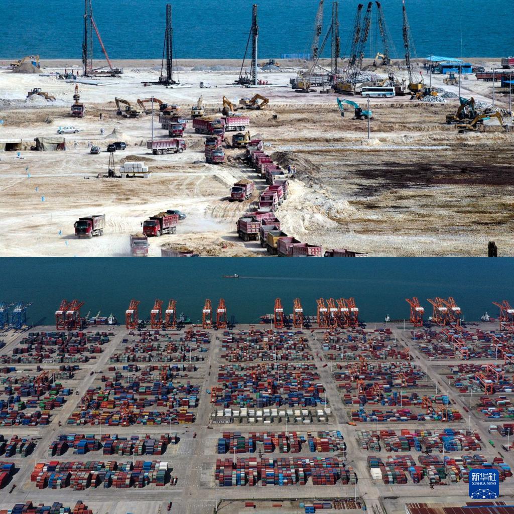 拼版照片:上圖為欽州港集裝箱碼頭建設期間的施工場面(2009年5月5日攝,欽州市檔案館提供);下圖為欽州港集裝箱碼頭(2022年8月28日攝,無人機照片)。