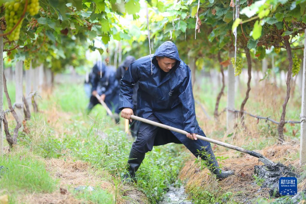9月14日,在浙江湖州市德清縣鐘管鎮下塘村金昊家庭農場,黨員搶險隊和果農一起疏通水渠,保持水系通暢。