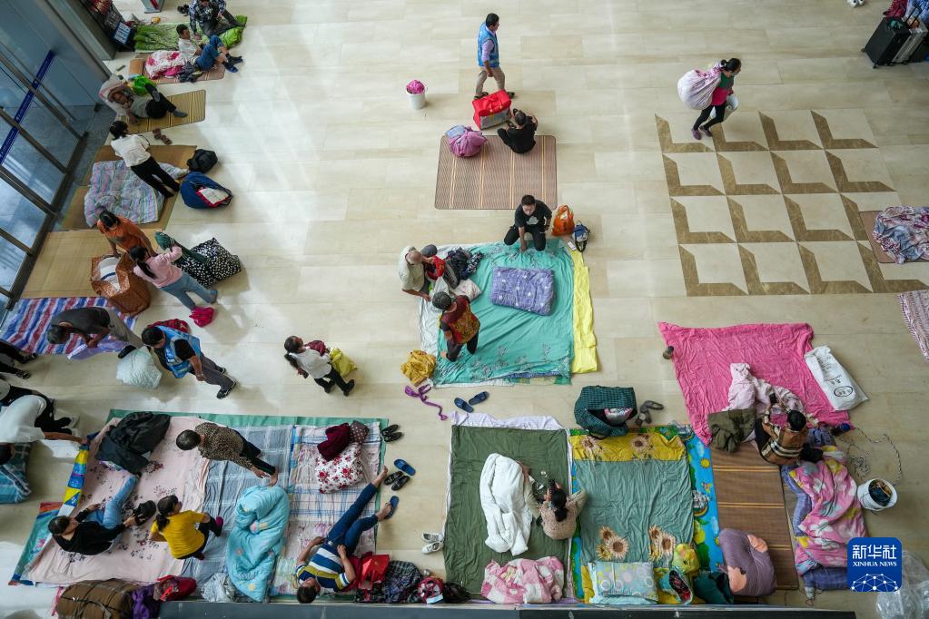 9月14日,在浙江湖州市長興縣大劇院避災安置點,群眾在鋪被褥。