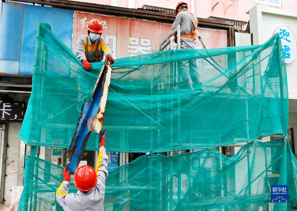 9月14日,在上海市金山區象州路,工作人員對沿街有安全隱患的店鋪招牌進行拆除。