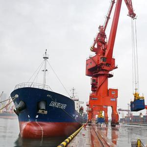 9月14日,一艘貨輪在山東港口青島港大港碼頭裝載集裝箱。