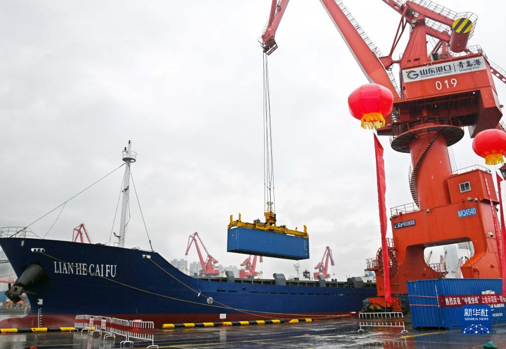 9月14日,一艘貨輪在山東港口青島港大港碼頭裝載集裝箱。