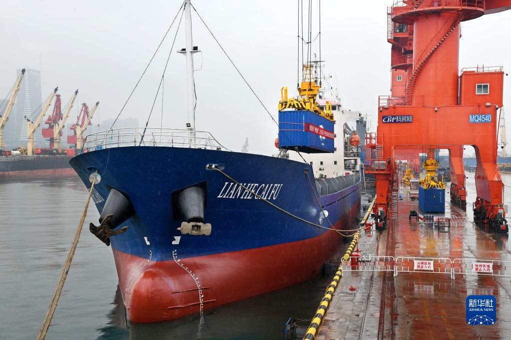 9月14日,一艘貨輪在山東港口青島港大港碼頭裝載集裝箱。