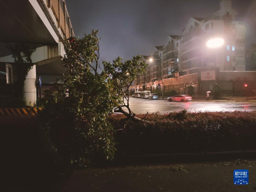 9月14日晚拍攝的浙江省舟山市普陀區東港海洲路綠化帶上被風吹倒的樹木(手機照片)。