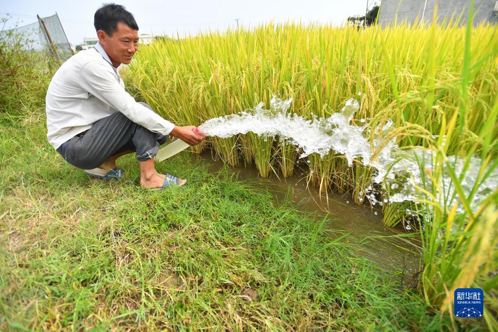 9月15日,在湘潭市雨湖區姜畬鎮泉塘子村,村民用剛抽來的水灌溉稻田。