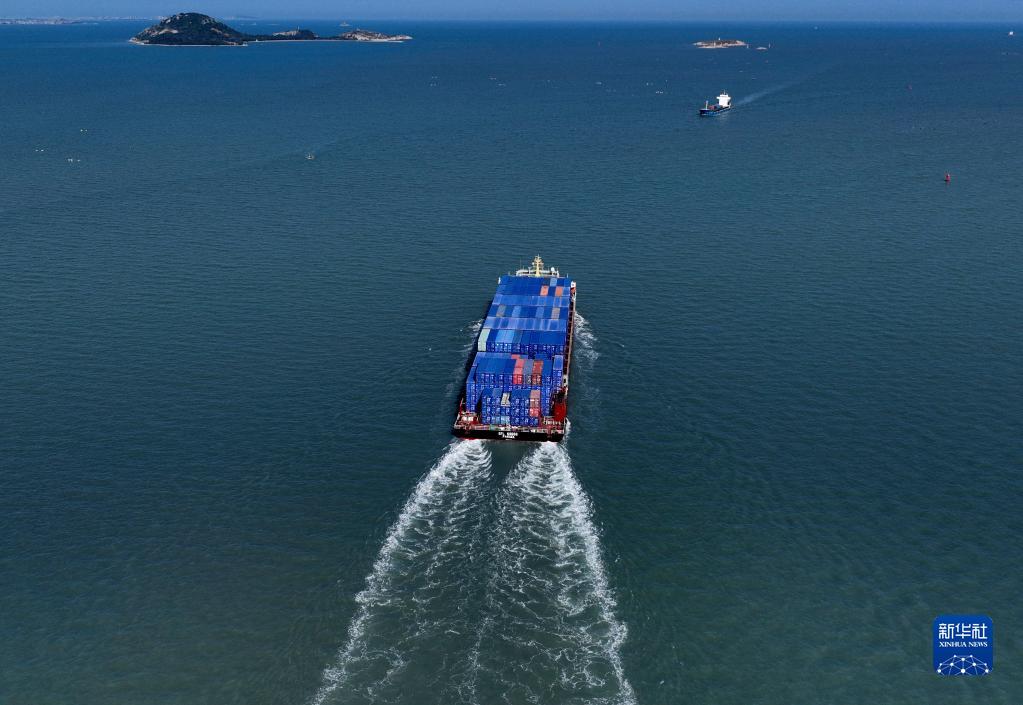 9月15日,“沃德菲寧波”號集裝箱輪行駛在海上(無人機照片)。
