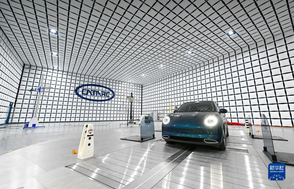 9月14日,在中汽中心新能源汽車科技創新基地電磁兼容部,新能源乘用車在接受電磁輻射水平測試。