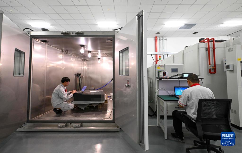 9月14日,在中汽中心新能源汽車科技創新基地能源系統部,工作人員準備某商用車動力電池組環境適應性試驗。