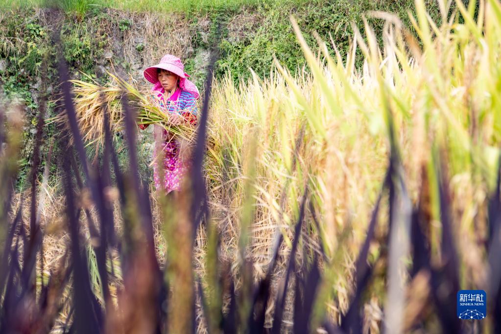 9月14日,在重慶市酉陽土家族苗族自治縣花田鄉,稻農在稻田里搶收稻谷。 新華社記者 唐奕 攝