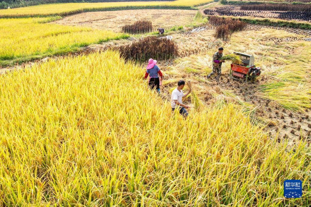 9月14日,在重慶市酉陽土家族苗族自治縣花田鄉,稻農在稻田里搶收稻谷。 新華社記者 唐奕 攝