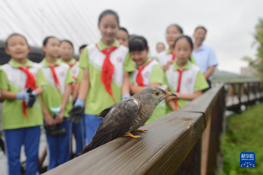 9月15日,在山東省青島市城陽區丹山小學科普日活動上,一只放歸的杜鵑準備起飛。