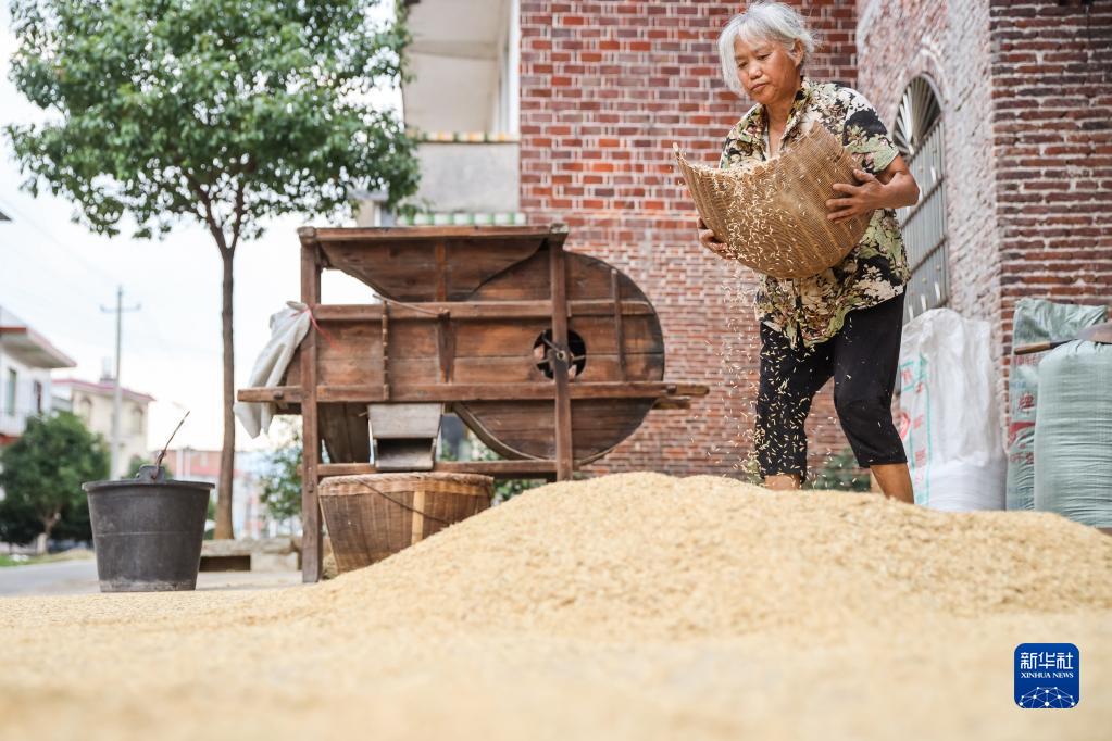 9月15日,湖南省永州市藍山縣塔峰鎮花果村,村民在晾曬稻谷。