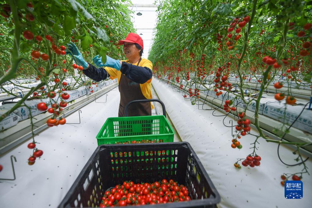 2022年5月31日,在浙江省嘉興市南湖區七星街道湘家蕩農業數字化工廠的數字化大棚內,農民在采摘立體栽培的番茄。新華社記者 徐昱 攝