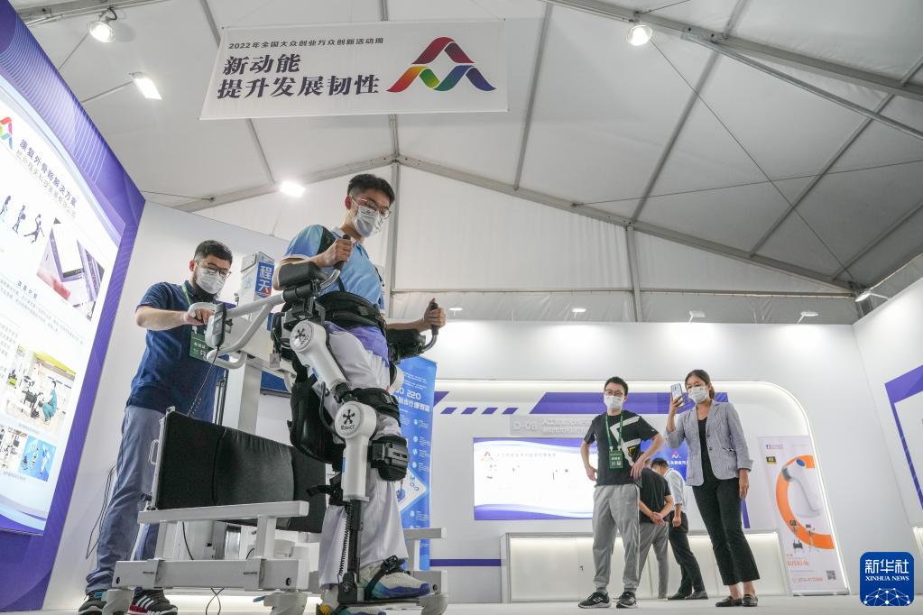 9月15日,在2022年全國大眾創業萬眾創新活動周合肥主會場的主題展區,來自杭州的程天科技發展有限公司展示其公司研發的下肢外骨骼步行康復器。