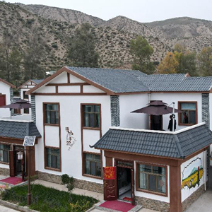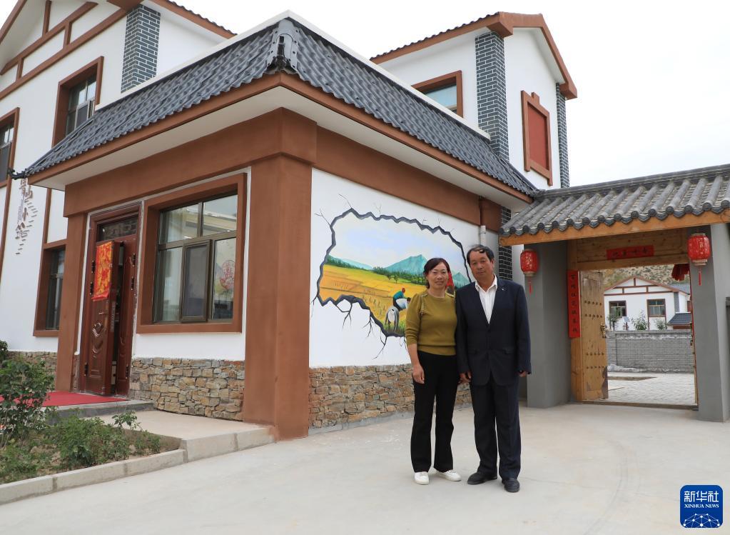 9月15日,在甘肅省武威市祁連鎮祁連村下河安置點,村民鄧發斌和妻子在新房門前合影。