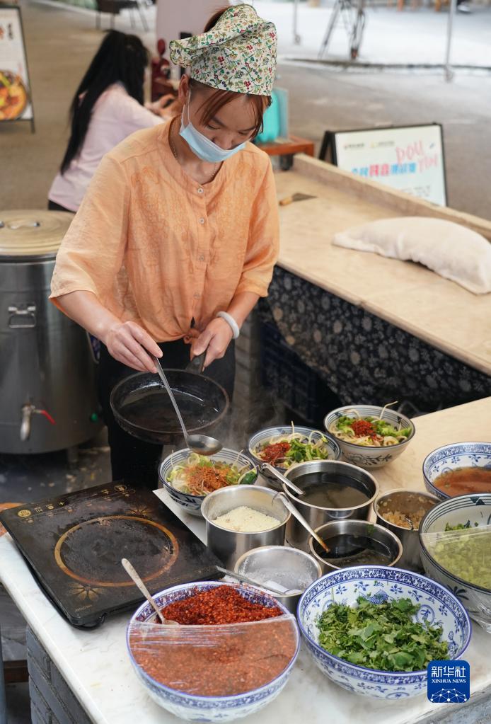 9月14日,在白鹿原影視城內,經營者李蒙蒙在制作油潑面。