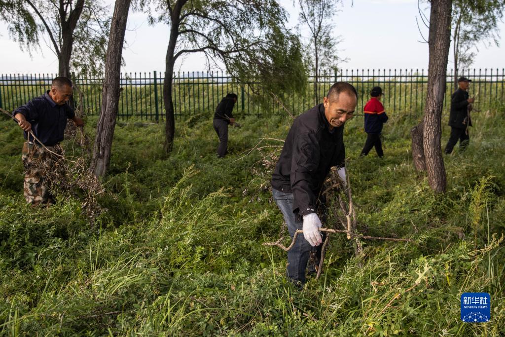 9月7日,李長吉(前)和工友在富錦國家濕地公園內清理大風吹折的樹枝。