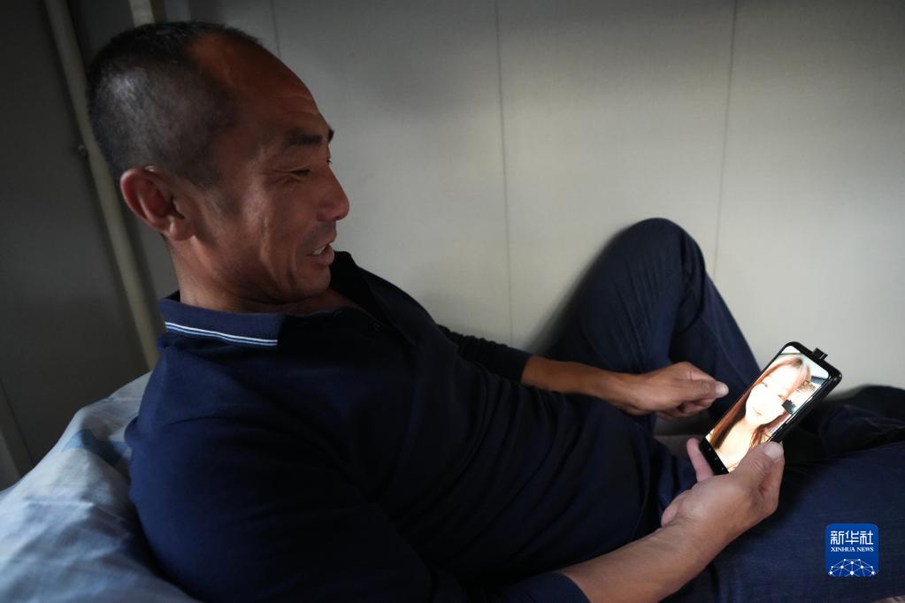 9月7日,忙碌了一天的李長吉在宿舍與女兒視頻通話。