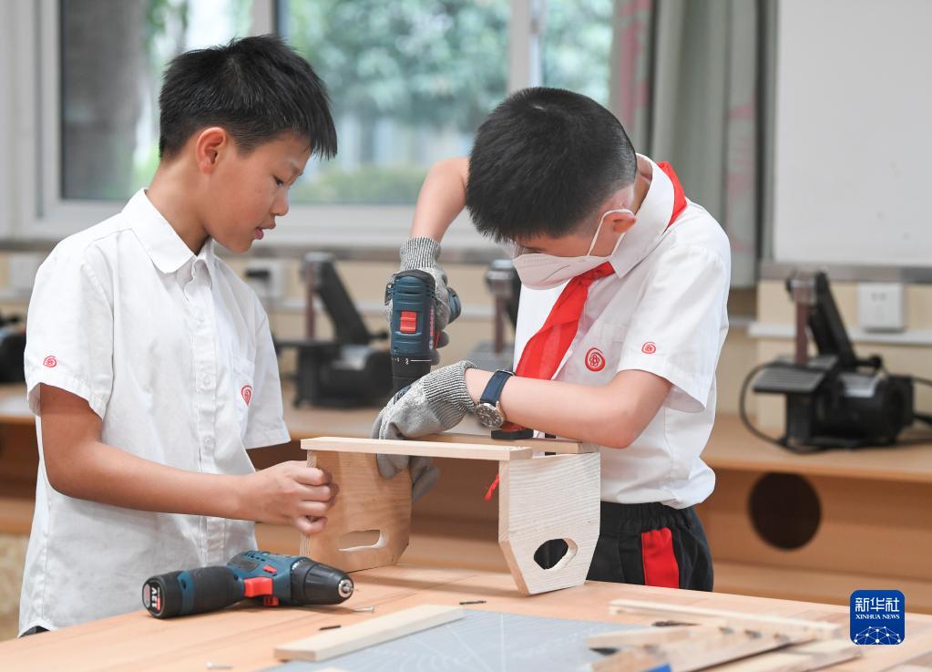 9月14日,重慶謝家灣學校學生在練習木工技巧。
