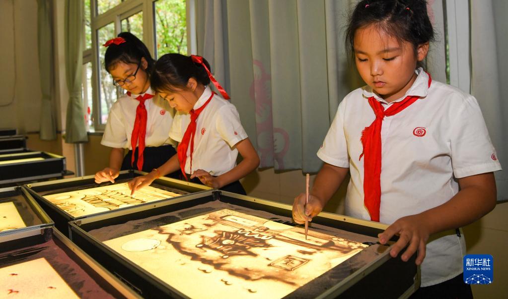 9月14日,重慶謝家灣學校學生在練習沙畫。