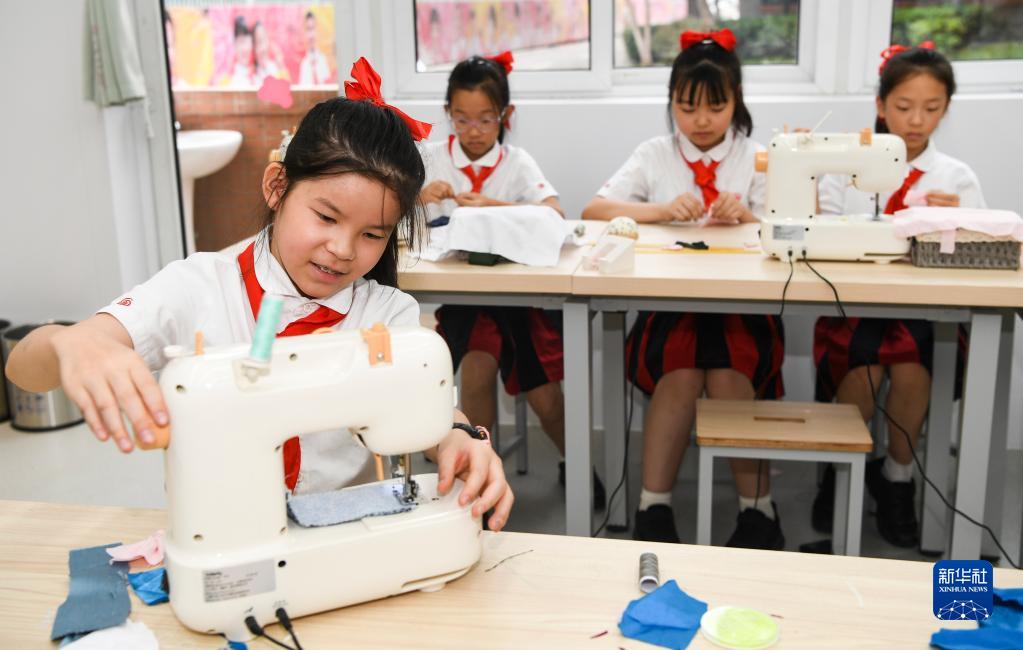 9月14日,重慶謝家灣學校學生在練習縫紉。