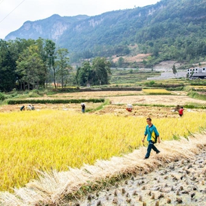 9月15日,投遞員張永洪行走在武陵山間的稻田田坎上。