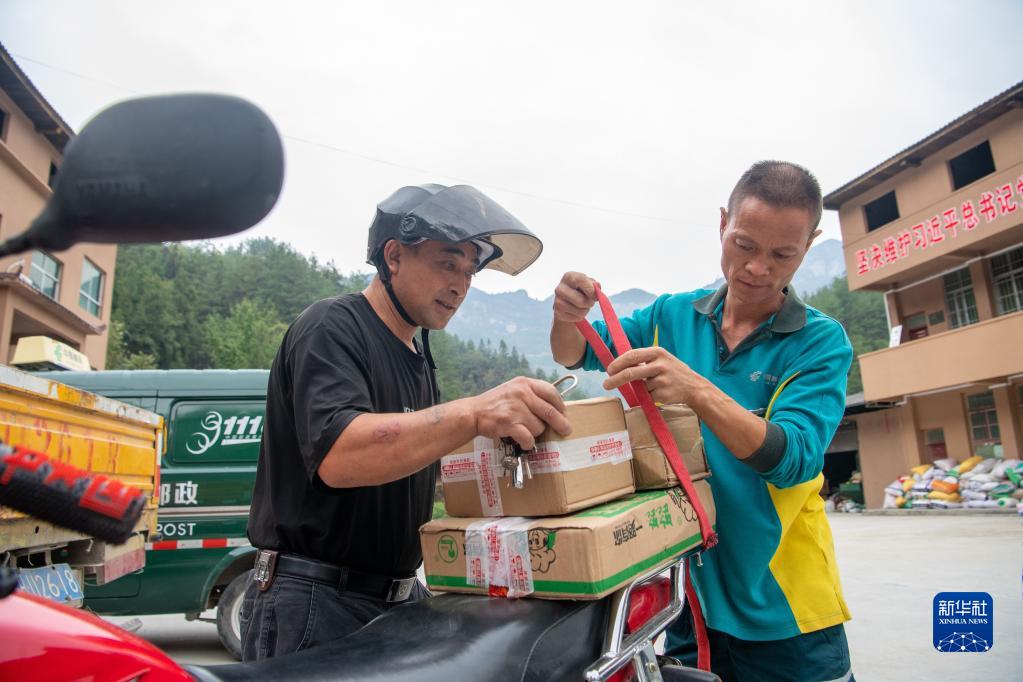 9月15日,在何家巖村村郵站,投遞員張永洪(右)幫助村民將收到的快遞物品綁上摩托車。