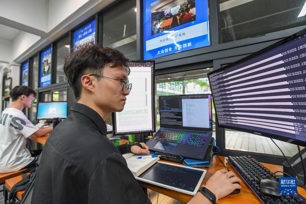 廣東工業大學“工大創谷”創客工坊團隊的梁梓熙(右)在編寫計算機視覺深度學習程序(9月14日攝)。