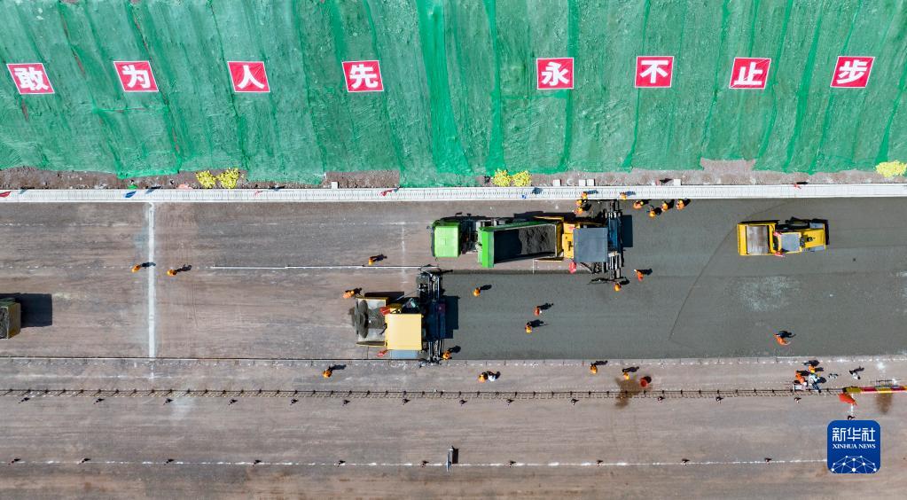 9月16日,來自中國能建葛洲壩路橋公司的建設者在武陽高速黃石段施工(無人機照片)。